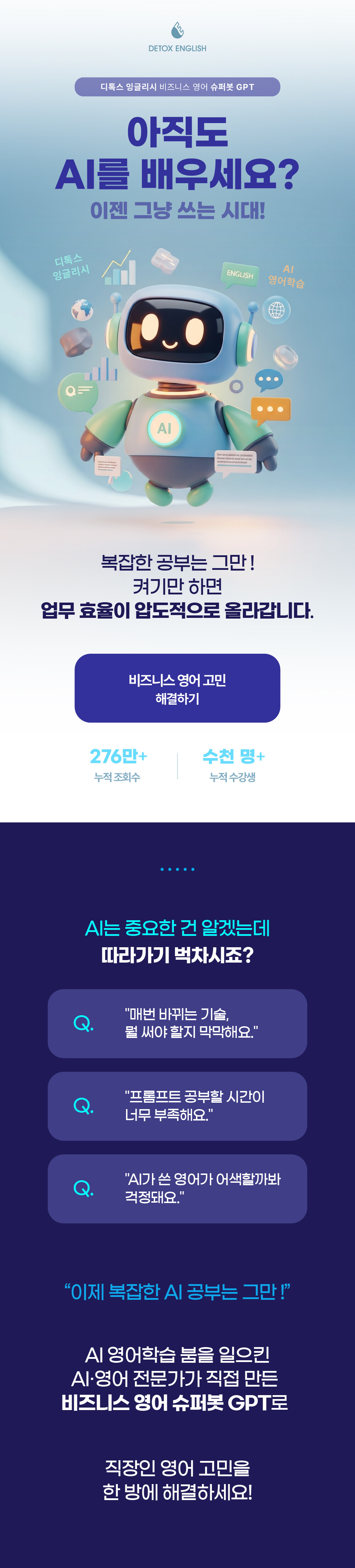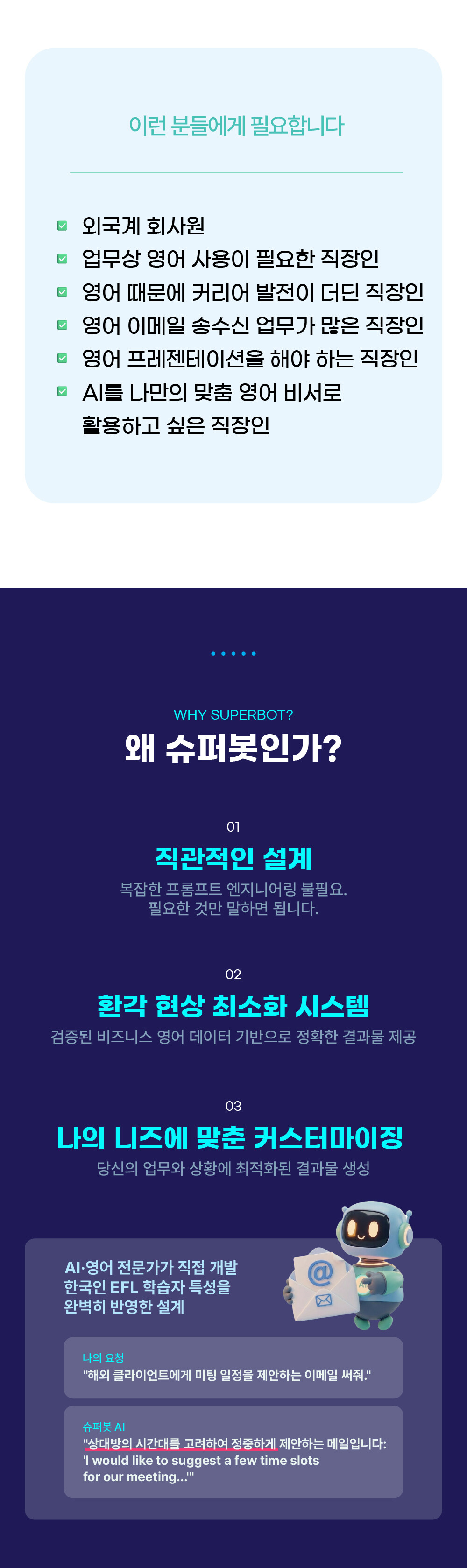 - 상품 구입 후, 2월 1일에 이메일을 통해 비즈니스 영어 슈퍼봇 GPT 링크를 받아보실 수 있습니다. (상품 구입 시 반드시 이메일 주소를 확인해 주세요.)